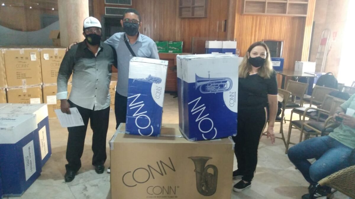 Recebemos três instrumentos musicais da marca CONN (01 Bombardão de 03 pistos, 01 Bombardino de três pistos e 01 sax alto)